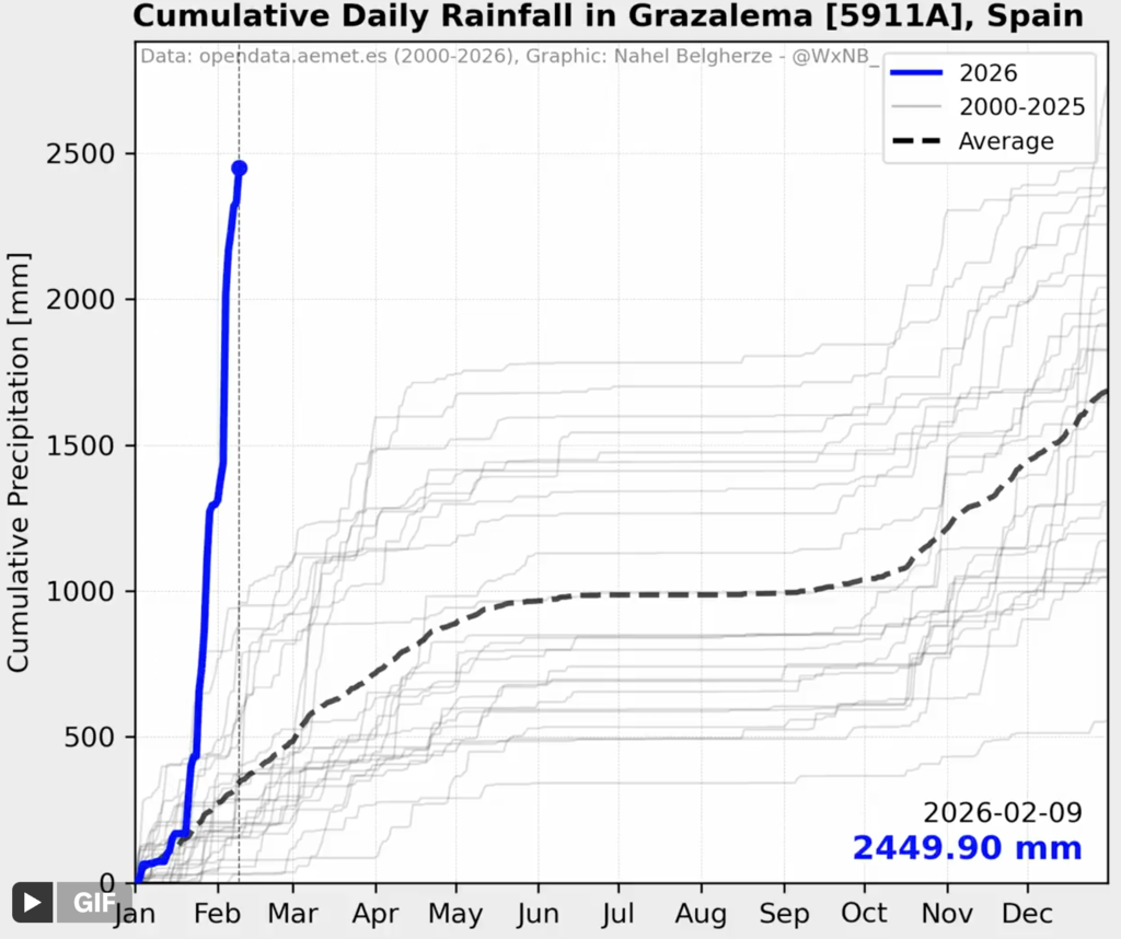 ¿»Hidrológicamente absurdo»? Lo es. Grazalema, según los datos disponibles, ha recibido más de 2.000 mm de lluvia sólo en los últimos 20 días. Es decir, más de un año normal de lluvia y estamos a principios de febrero.